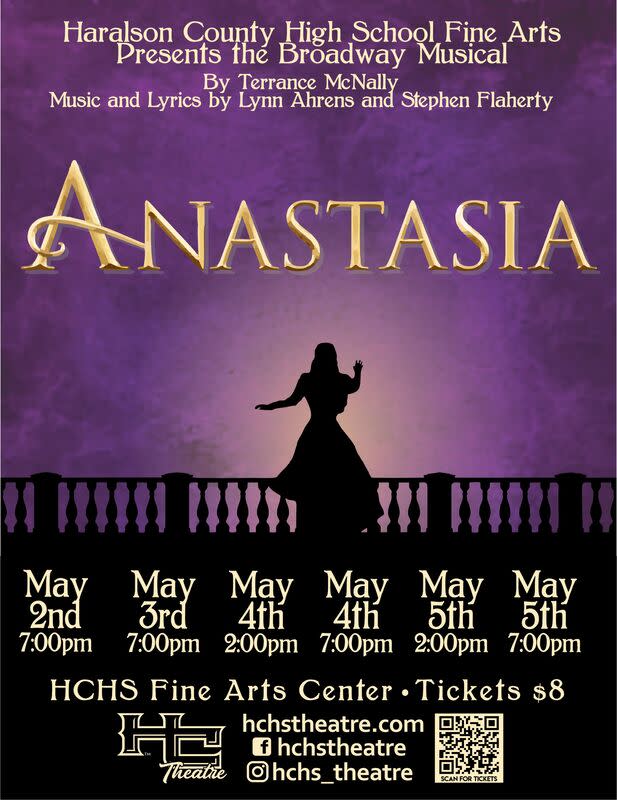 The Haralson County High School Theater presents Anastasia: The Musical! This Broadway version of the animated classic is more mature, but equally dazzling show based on the animated classic transports its audience from the twilight of the Russian Empire to the euphoria of Paris in the 1920s, as a brave young woman sets out to discover the mystery of her past. Pursued by a ruthless Soviet officer determined to silence her, Anya enlists the aid of a dashing con man and a lovable ex-aristocrat. Together, they embark on an epic adventure to help her find home, love and family. Tickets are available at https://www.hchstheatre.com/.Images