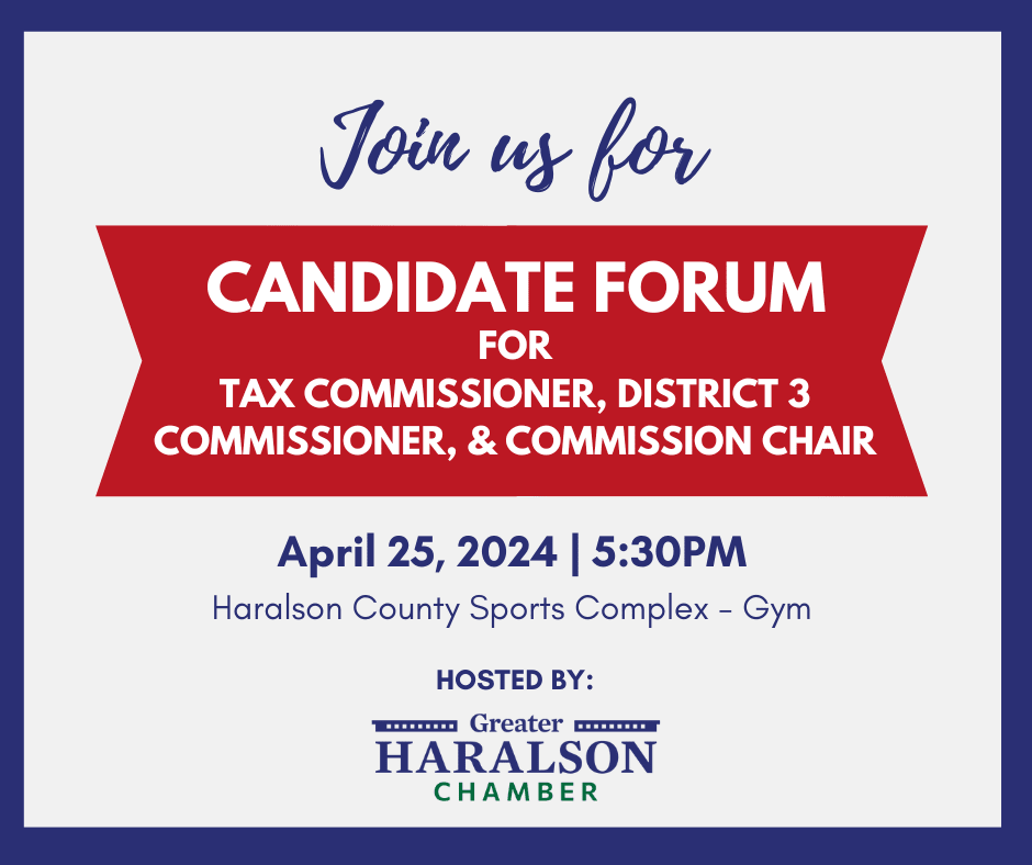 We're thrilled to announce that we'll be hosting the 2 Candidate Forums for the upcoming election on May 21, 2024. April 23rd Candidate Forum: Magistrate Judge, Sheriff, & Haralson County School Board April 25th Candidate Forum: Tax Commissioner, District 3 Commissioner, & Commission Chair The Candidate Forums will be held at the Haralson County Sports Complex - Gym off of Macedonia Church Road in Buchanan. Also, we will have a live stream on our Facebook page for these forums.Images