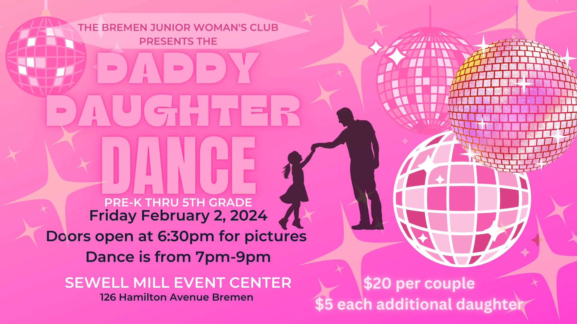 The Bremen Junior Woman's Club presents the 2024 Daddy Daughter Dance. Fathers, brothers, uncles, grandfathers - escort your favorite daughter, sister, niece, or granddaughter to our annual Daddy Daughter Dance. The dance is for girls from Pre-K through 5th grade. It's $20 per couple at the door and $5 per additional daughter. There will be a photographer on hand to capture your special night. Corsages will be available for $7-$15.Images