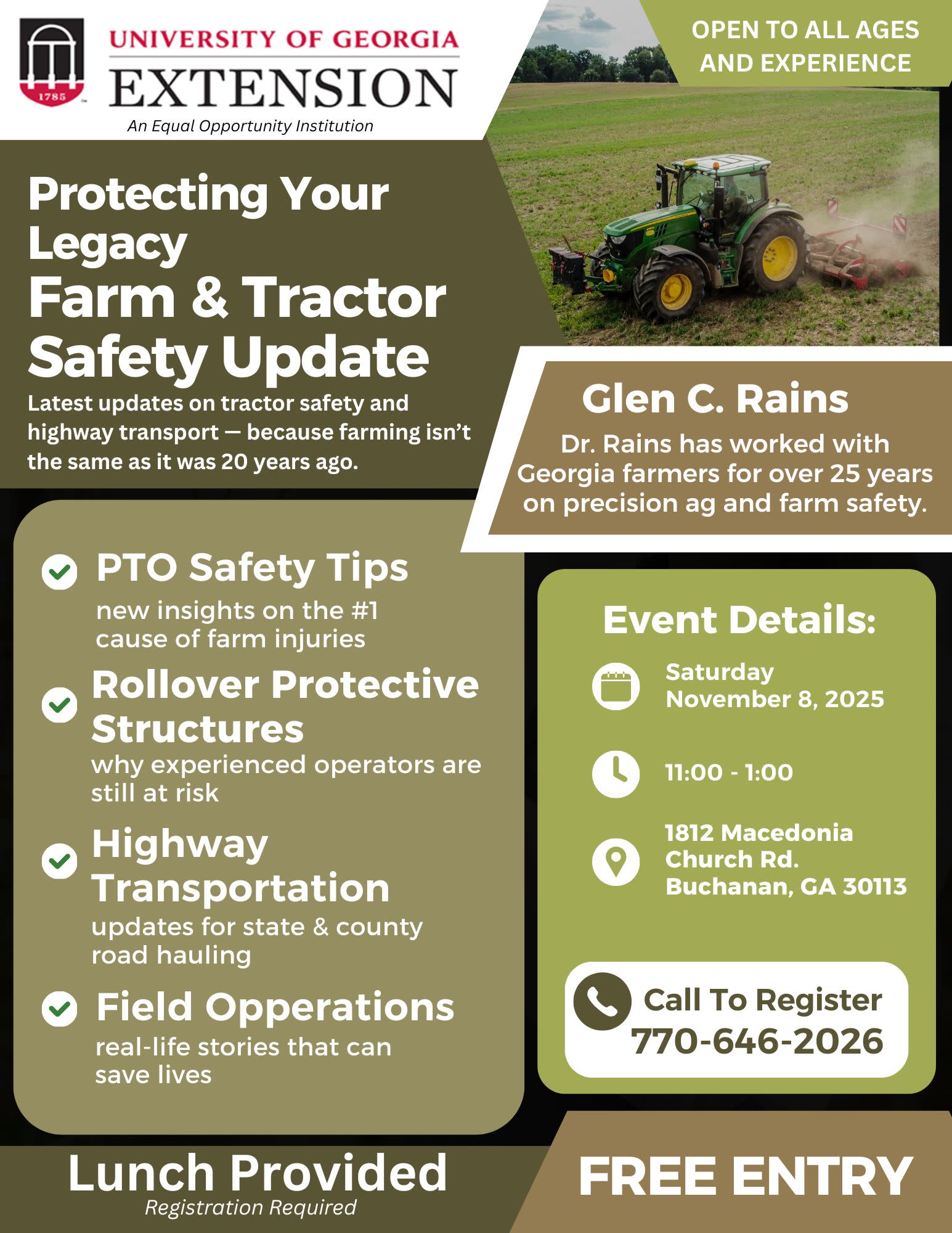 UGA Extension is hosting this educational opportunity on Saturday, November 8 at The Callaway Livestock Pavilion (1812 Macedonia Church Rd, Buchanan, GA 30113). The program will cover crucial safety procedures and best practices for modern agricultural operations, helping to ensure the well-being of our neighbors. Register: Please encourage any interested, particularly those who farm or work with tractors, to Call 770-646-2026 to Register to ensure a lunch will be provided. Share: We ask for your help in spreading the word! Please share this information with your friends, family, and any community members who could benefit from improved safety training.Images