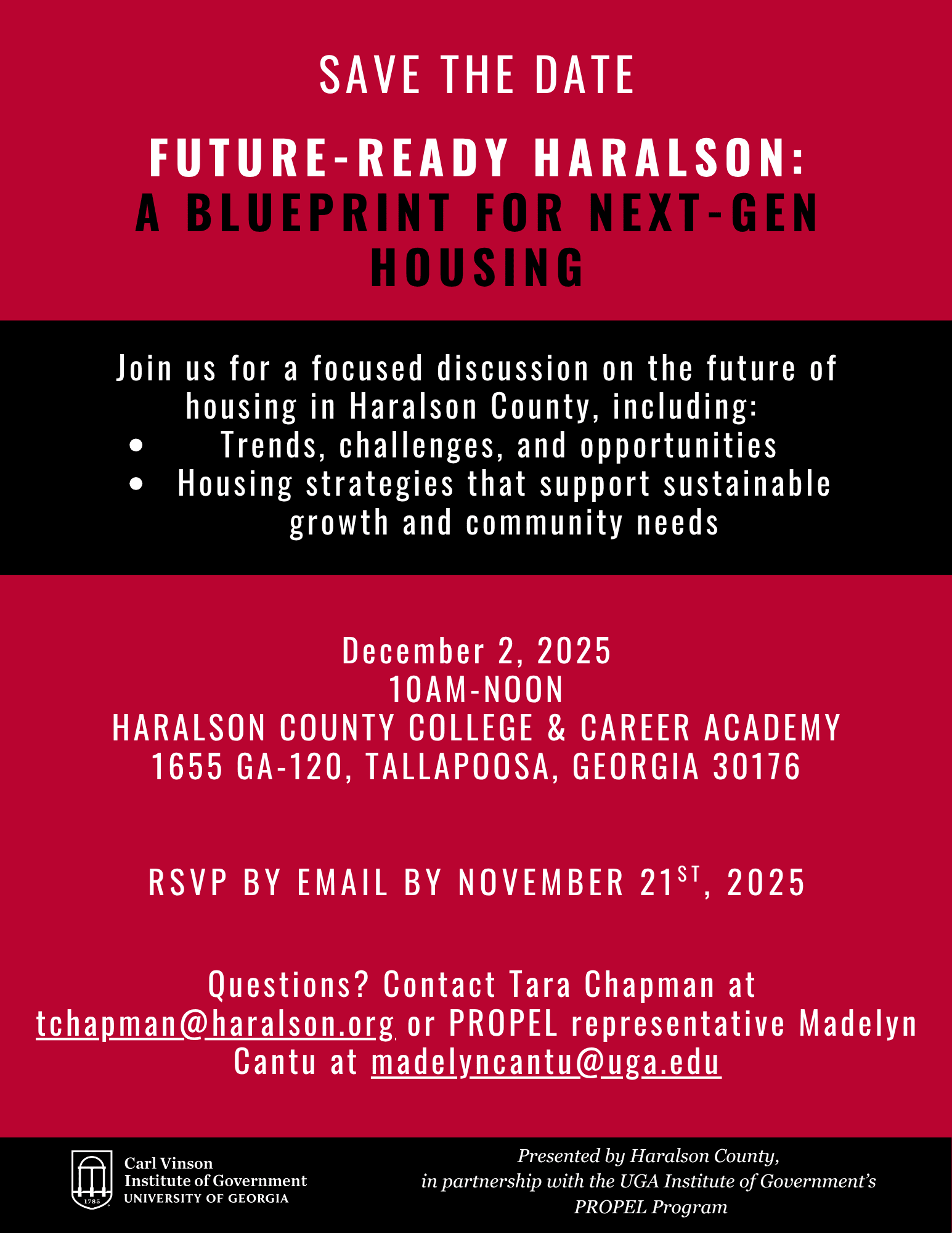 Future -Ready Haralson: A Blueprint for Next-Gen Housing. Join us for a focused discussion on the future of housing in Haralson County, including: Trends, challenges, and opportunities; housing strategies that support sustainable growth and community needs. RSVP by emailing Tara Chapman at tchapman@haralson.orgImages
