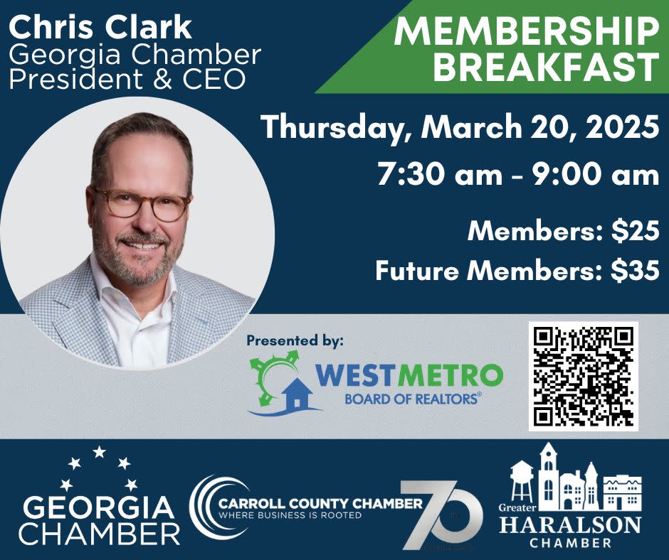 Join us for our Membership Breakfast featuring Chris Clark, President of the Georgia Chamber presented by West Metro Board of Realtors. His presentations are packed with valuable insights on Georgia’s business landscape. Don’t miss this opportunity to learn and connect!