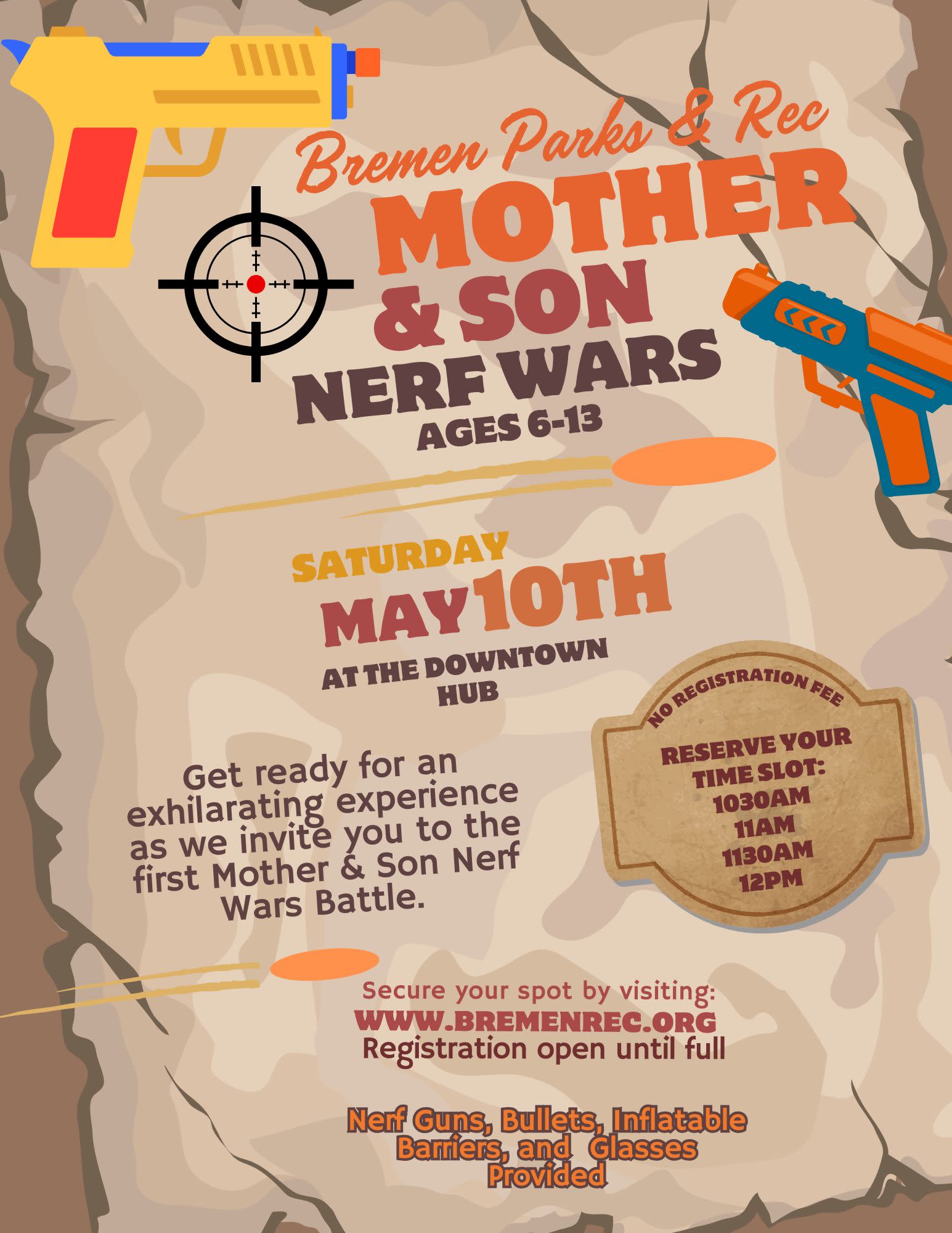 Calling all Mothers and Sons, we are hosting the very first and exciting nerf battle at The Hub in Downtown Bremen! For kids ages 6-13 years old AND registration is FREE, just sign up for a time slot while spots last! Each Mother/Son duo will have a chance to battle it out for 3 intense rounds, each equipped with 50 rounds of bullets. We will supply all nerf guns, bullets, inflatable barriers, and eye wear for the rounds. Food trucks will be on location for a meal after (not included in registration). See you on the battle field!
