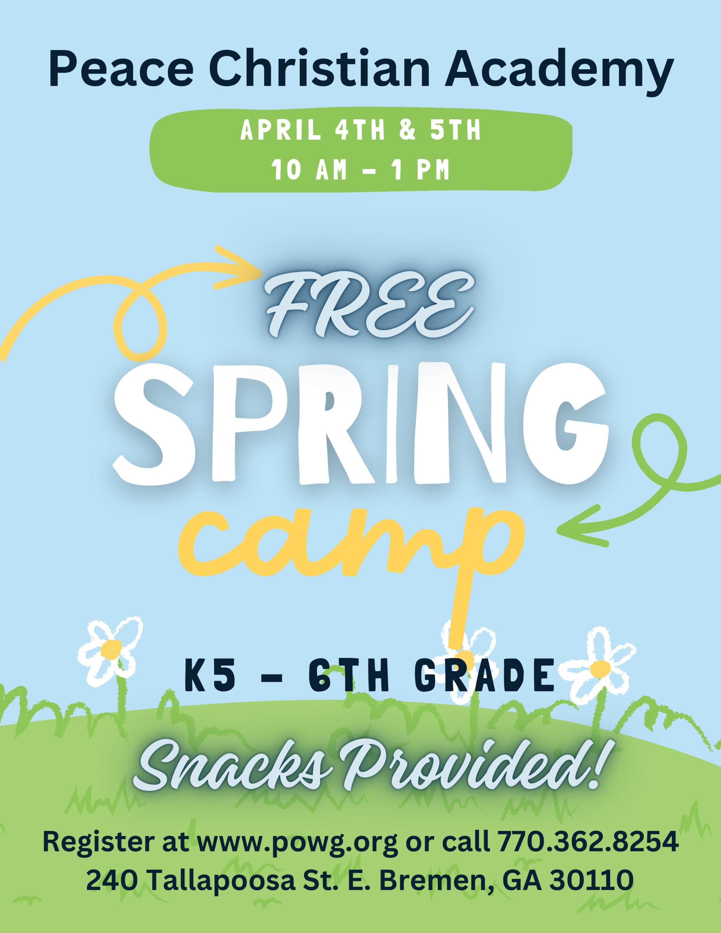Join Peace Christian Academy for their FREE Spring Camp! It will be for children in grades K - 6th Grade. Snacks will be provided. Register at www.powg.org or call 770.362.8254.Images